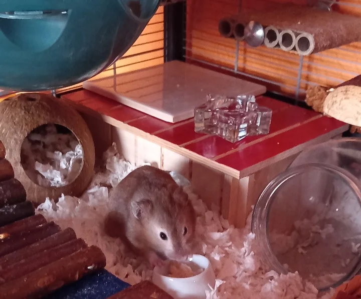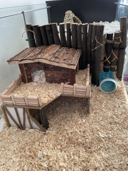 Houses or nesting boxes in the cage are important for hamsters, as they can mimic an underground burrow so the hamster can have more normal behaviours and keep their own environment organised and even clean sometimes.